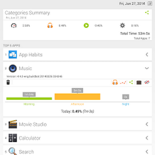 App Habits assists you to explore your app habits with your device. Automatically it takes care of how you use apps and it is able to provide statistics and fancy visualization. One of the most amazing feature are the graphs, you can simply visualize in which moment of the day you used the app as the part of the day spent with it. App Habits adapts the information and its behavior to your needs, but lets to you the control: you can categorize, hide, share or even delete the app from your device. Another magic feature is the journal that is the possibility to navigate back in time and see which apps have been used in the past. (Check the in app help for more info)
